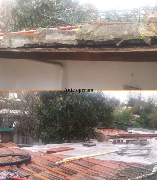 L'infiltrazione d'acqua era causata dalla rottura e dal mal posizionamento di alcune tegole, e dalla poca pendenza della copertura. L'acqua una volta entratata penetrava facilmente lo strato di massetto, che nel tempo si era disgregato, arrivando allo strato di guaina bituminosa rotta in diversi punti, raggiungendo cosi la struttura in legno sottostante.